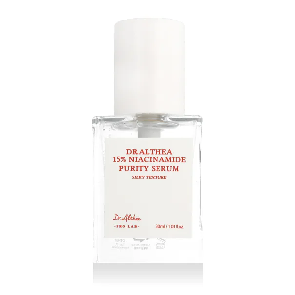 Dr.Althea 15% Niacinamide Purity Serum 30 ml to serum do twarzy z 15% niacynamidem, które ma na celu ujednolicenie kolorytu skóry, zmniejszenie nadmiernego wydzielania sebum i poprawę ogólnej tekstury skóry. To skoncentrowane serum rozjaśniające z niacynamidem pomaga zminimalizować widoczność porów, łagodzi zaczerwienienia i promuje zdrowszy, wyraźniejszy wygląd skóry. Lekka konsystencja szybko się wchłania i nie pozostawia uczucia lepkości.