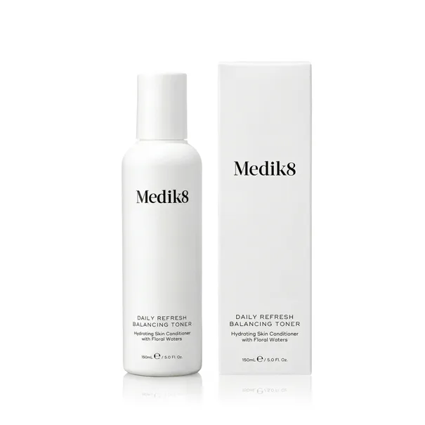 Medik8 DAILY REFRESH Balancing Toner 150 ml to tonik do twarzy przeznaczony do codziennego odświeżania, łagodzenia i równoważenia skóry. Ten równoważący tonik pomaga przywrócić naturalne pH skóry po oczyszczeniu, zminimalizować widoczność porów i przygotować skórę do dalszej pielęgnacji. Jego delikatna formuła sprawia, że jest odpowiedni dla wszystkich rodzajów skóry, w tym skóry wrażliwej, i pozostawia skórę odświeżoną, nawilżoną i ukojoną.