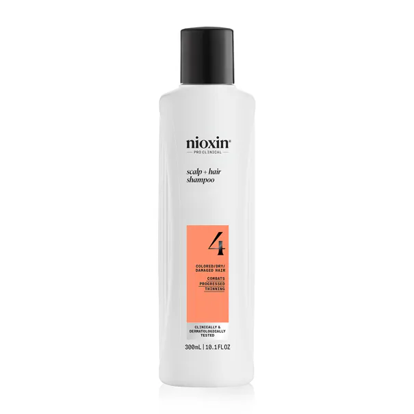 Nioxin System 4 Scalp + Hair Shampoo Progressed Thinning 300 ml to profesjonalny szampon przeznaczony do włosów farbowanych z zaawansowanym przerzedzaniem. Ten oczyszczający szampon do włosów przerzedzających się pomaga usunąć sebum, zanieczyszczenia i pozostałości produktów do stylizacji ze skóry głowy i włosów, tworząc optymalne środowisko dla zdrowszego wyglądu włosów. Pozostawia włosy świeże, lekkie i wyraźnie pełniejsze.